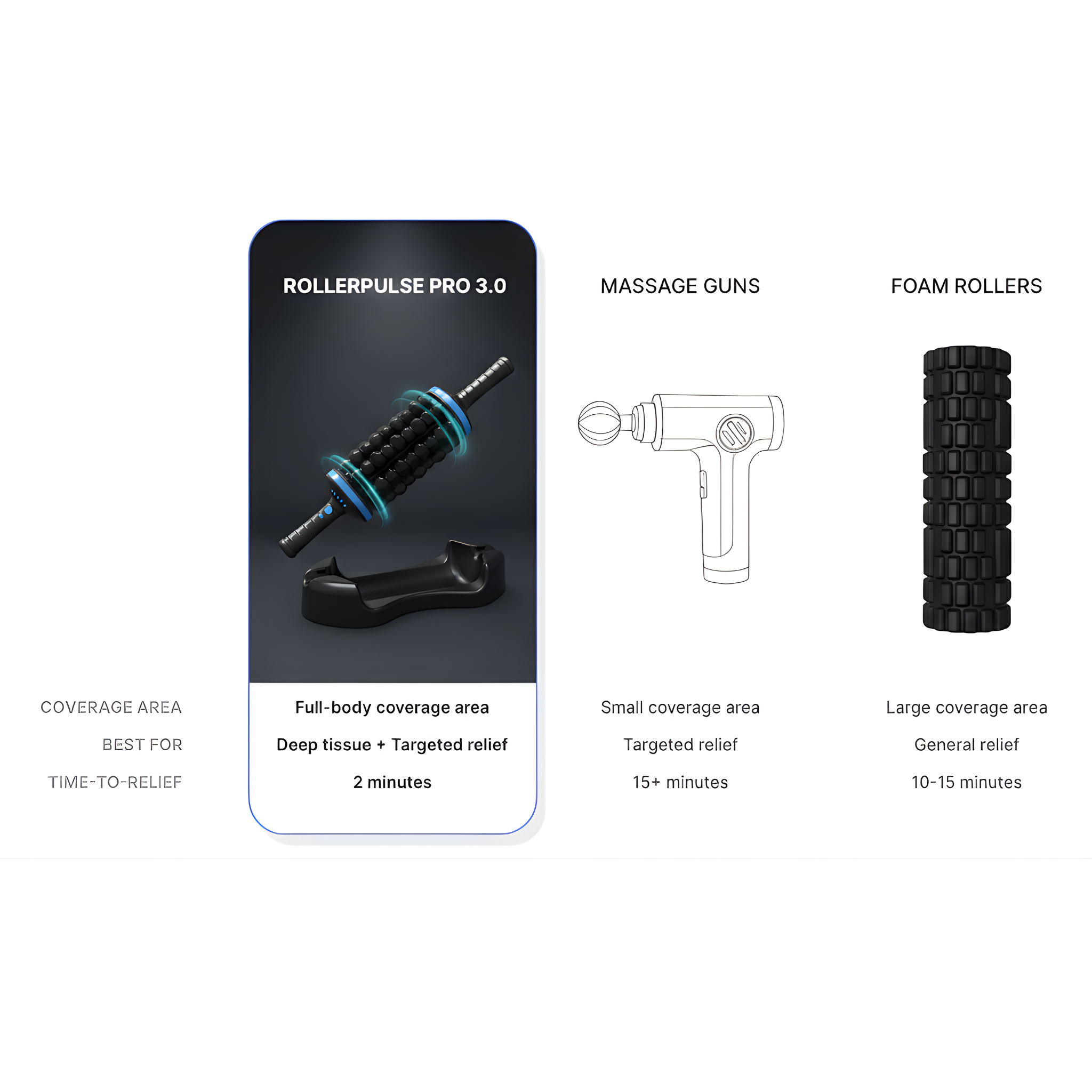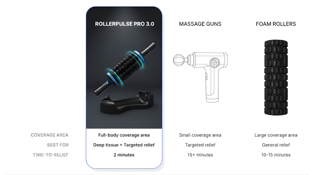 The RollerPulse Pro effectively relieves muscle tension, soreness, and pain associated with various conditions including sciatica, plantar fasciitis, IT band syndrome, and general muscle tension and tightness.